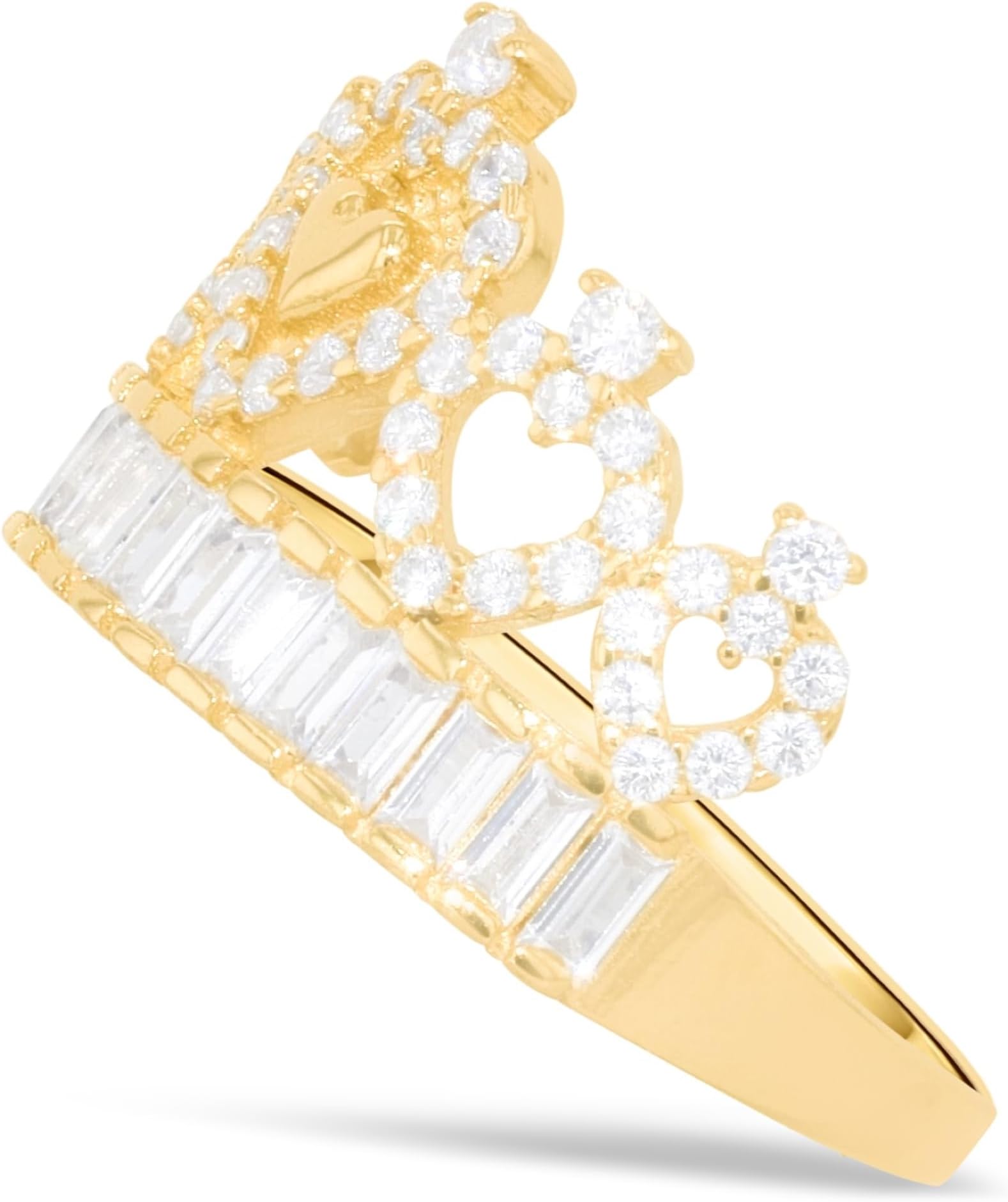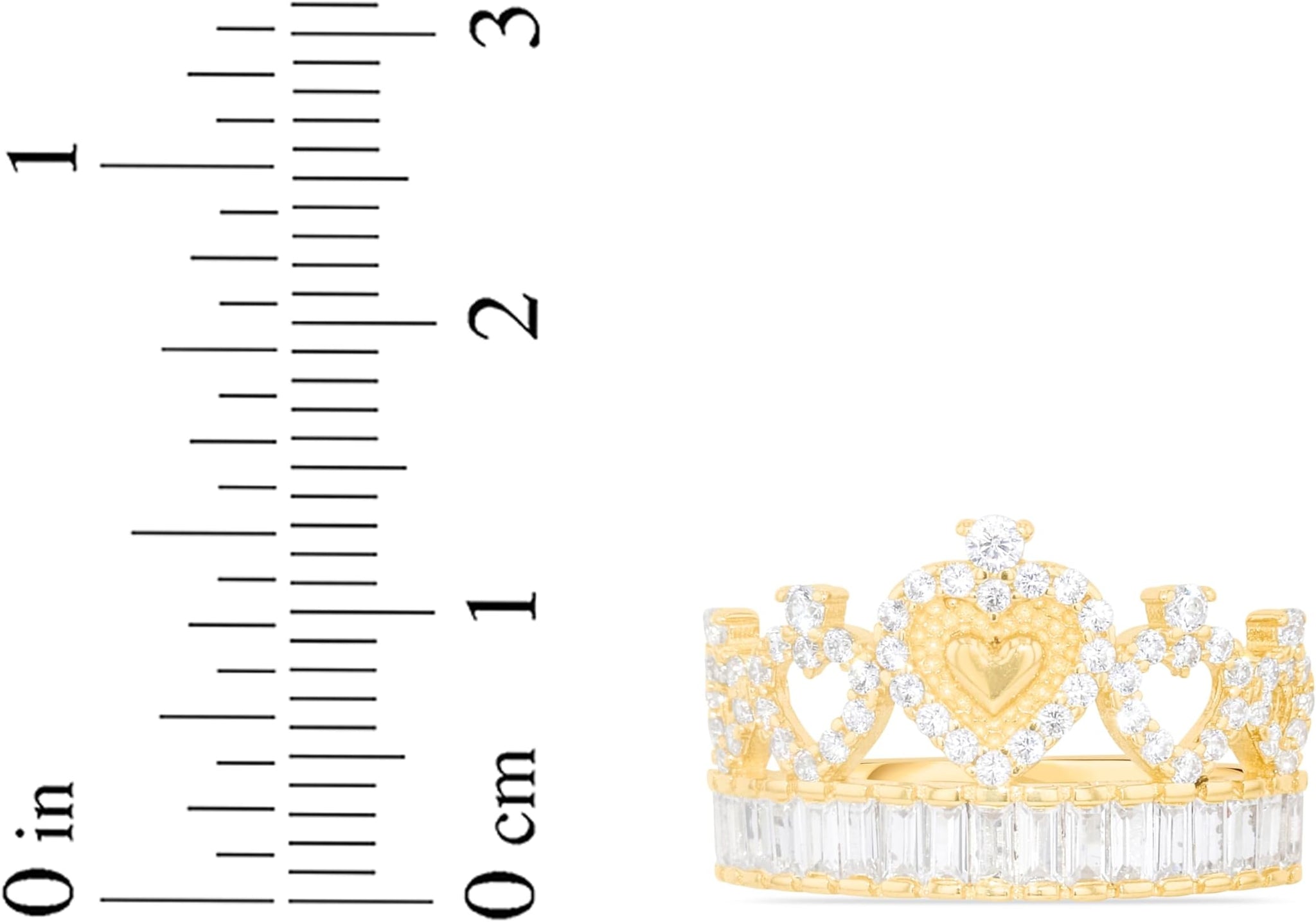 FEATURES— Designed with an exquisite crown motif and a central heart accent, this ring embodies romance and royal beauty. Sparkling CZ stones and baguette accents create a mesmerizing play of light and luxury.