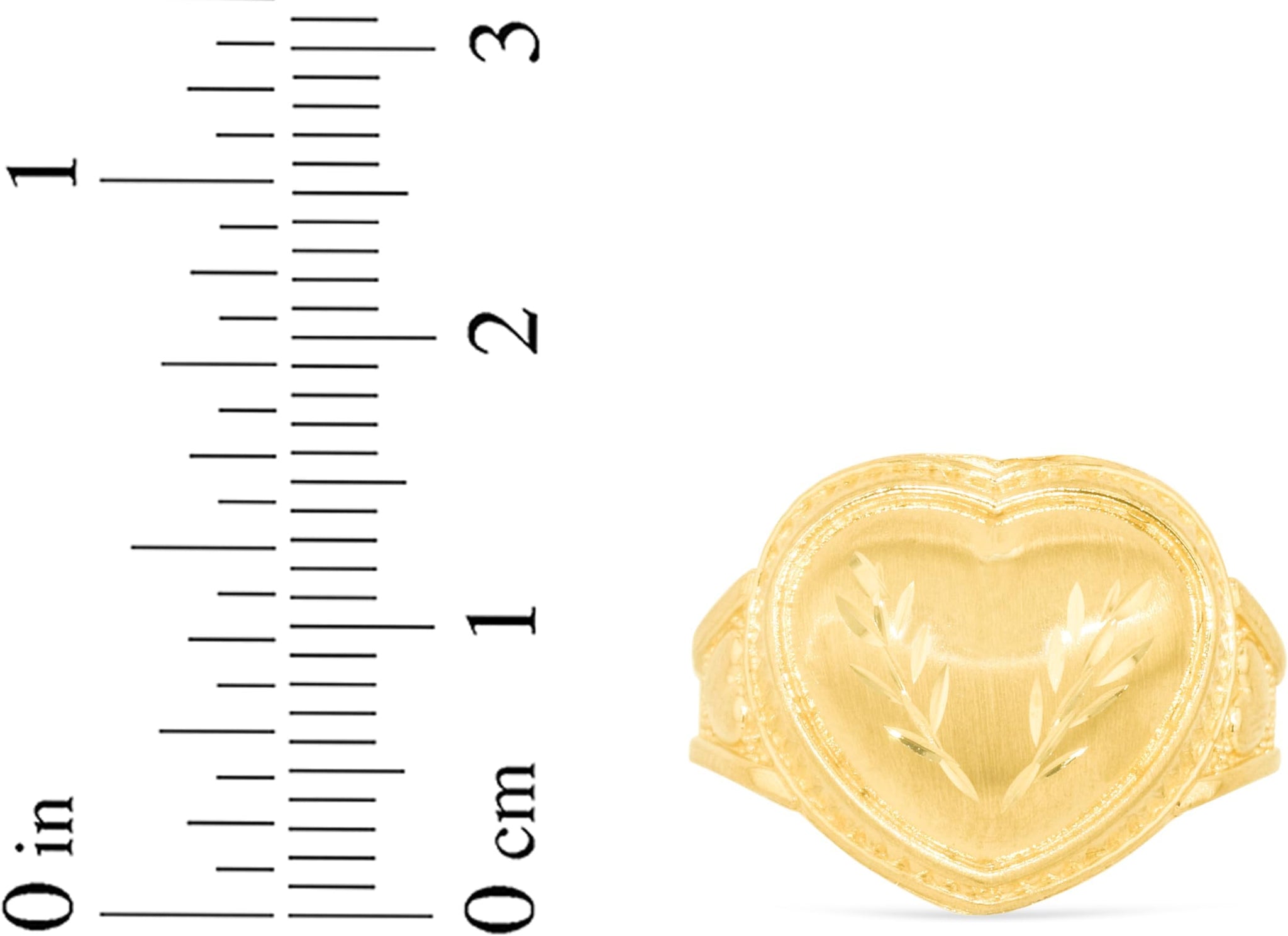 FEATURES— Graceful heart design accented with delicate leaf motifs, complemented by a satin finish and diamond-cut accents for texture and sparkle.