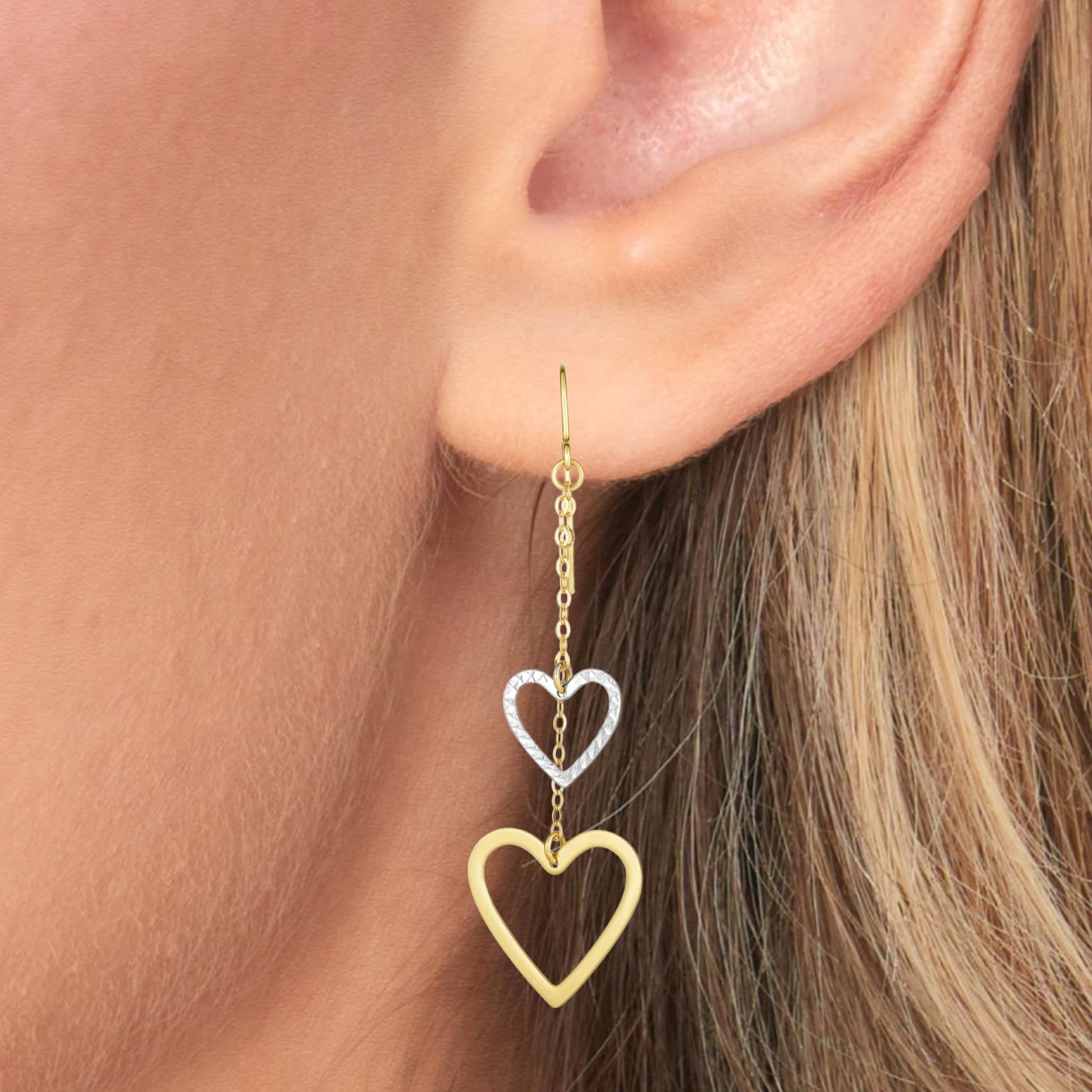 FEATURES— Designed with a double heart two-tone drop style, these earrings beautifully intertwine warm yellow and cool white gold for a romantic and modern appeal. The layered heart design symbolizes love and unity, adding a graceful touch to every movement.