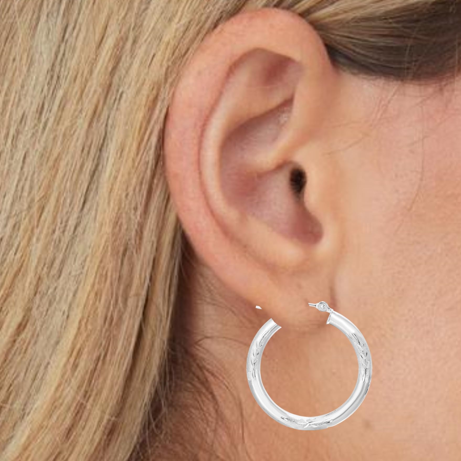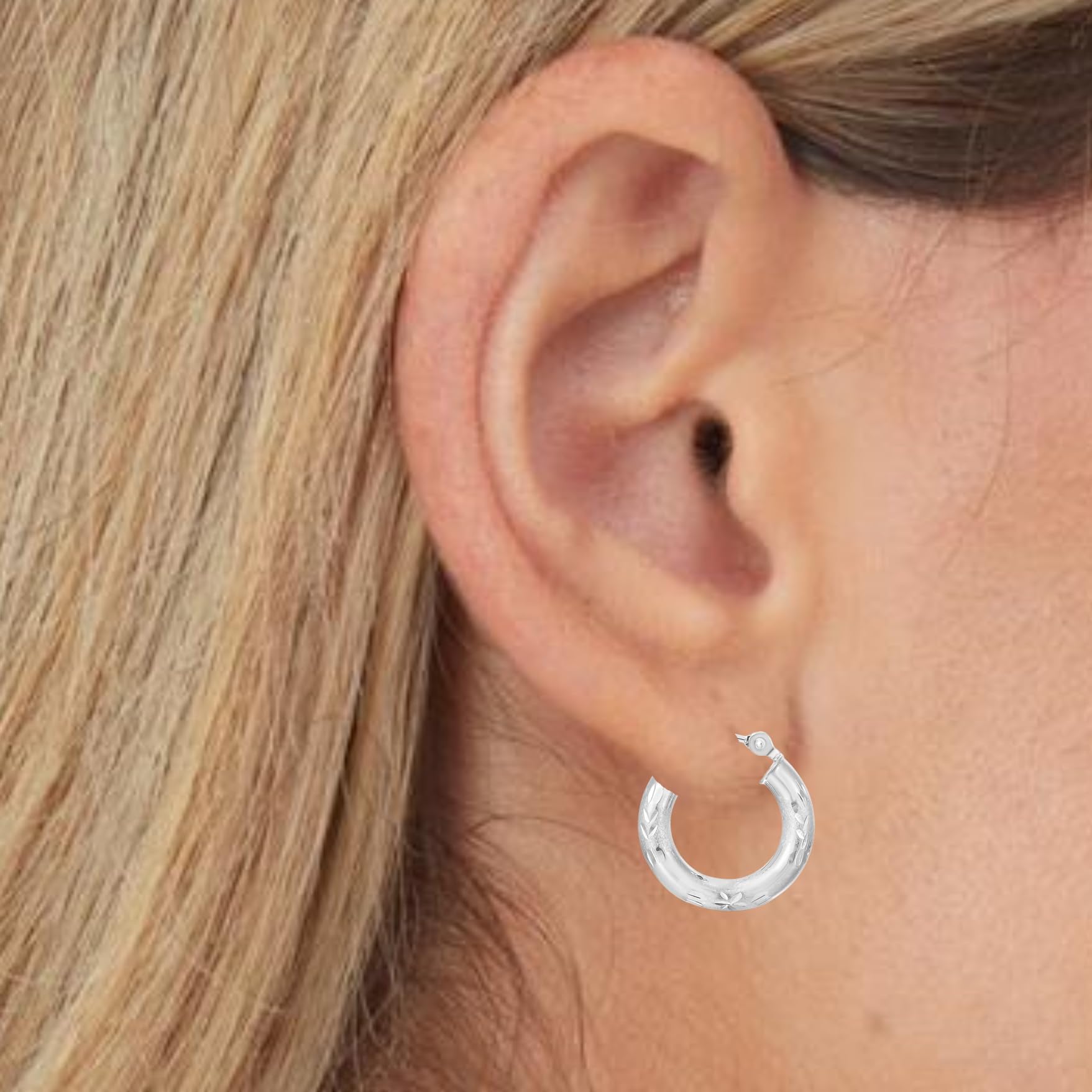 FEATURES— Designed with elegant diamond cut and polished hoop earrings featuring a secure hinged clasp, they blend classic craftsmanship with modern elegance. The diamond-cut texture reflects light beautifully, while the smooth polish enhances their radiant appeal.