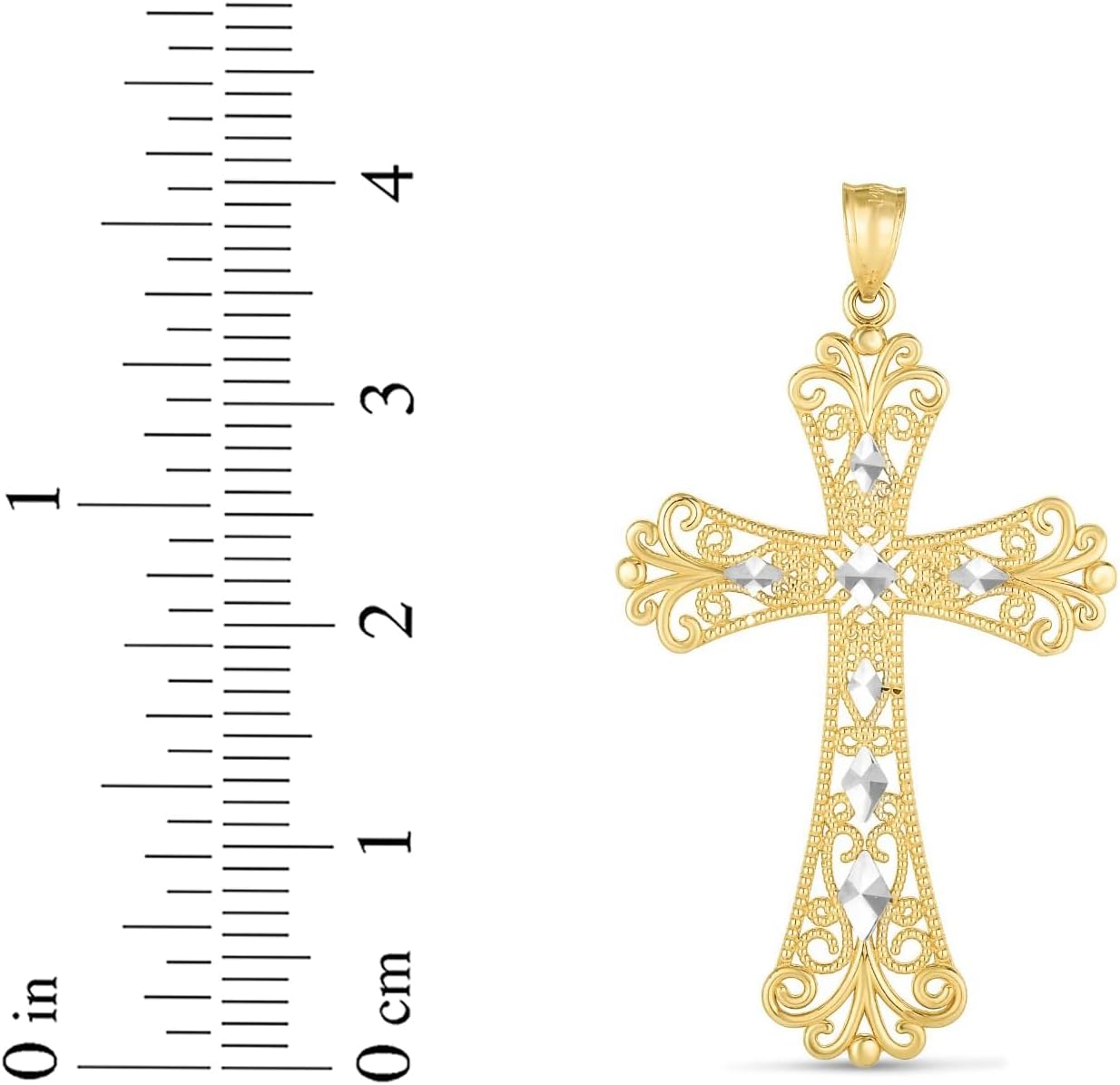 FEATURES— Styled with intricate filigree openwork and lozenge-shaped detailing, this cross pendant blends artistry with sacred symbolism. The combination of yellow and white gold tones creates a refined and eye-catching design.
