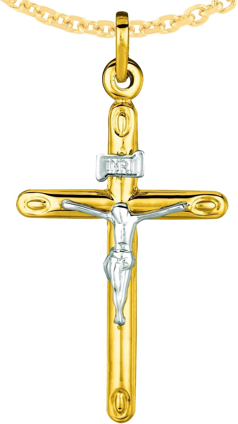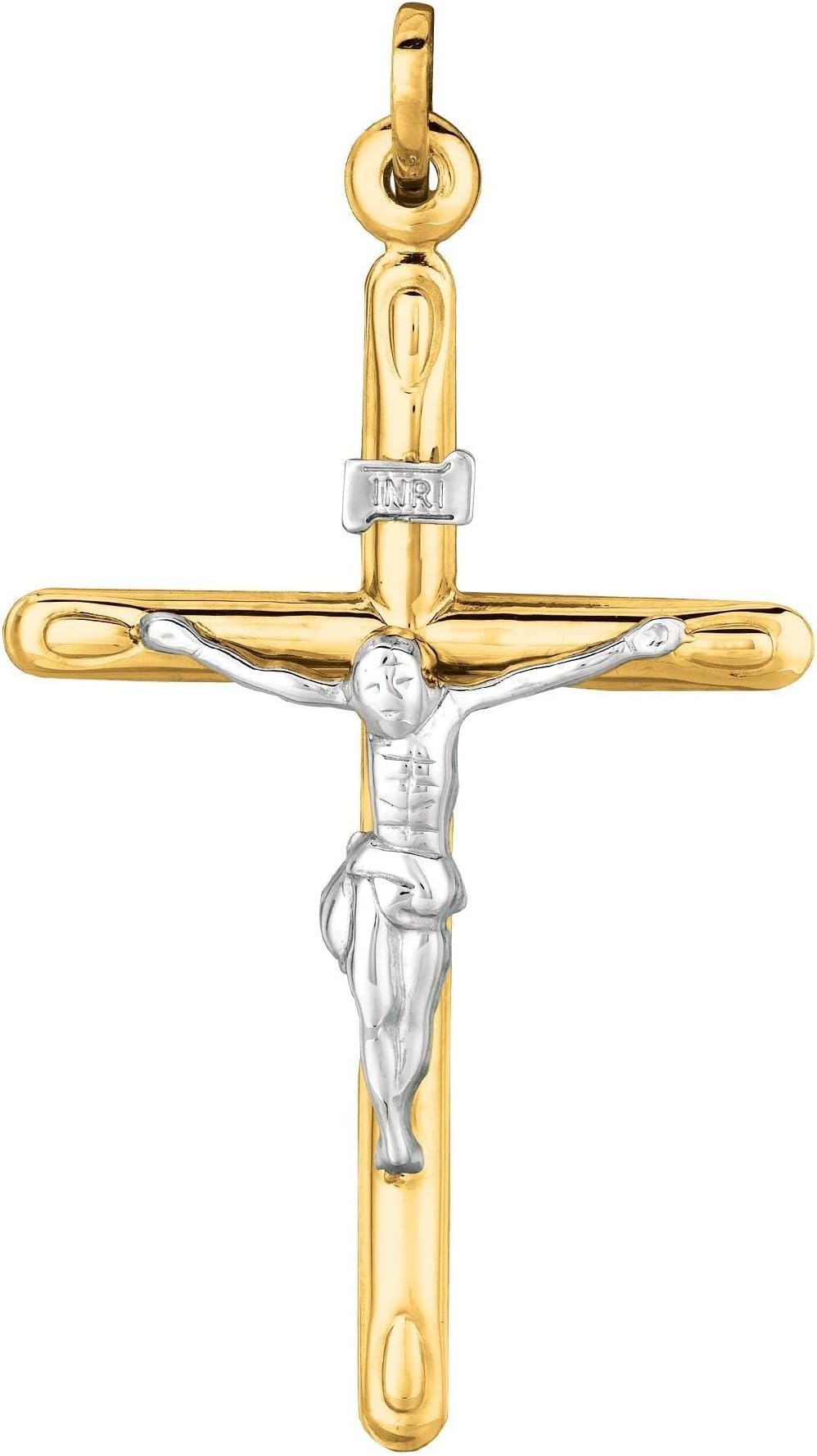 FEATURES— Styled in a classic cylinder tube crucifix design with INRI inscription, this pendant balances sacred devotion with bold craftsmanship. The polished yellow gold cross contrasts beautifully with the white-toned figure of Christ for an inspiring finish.