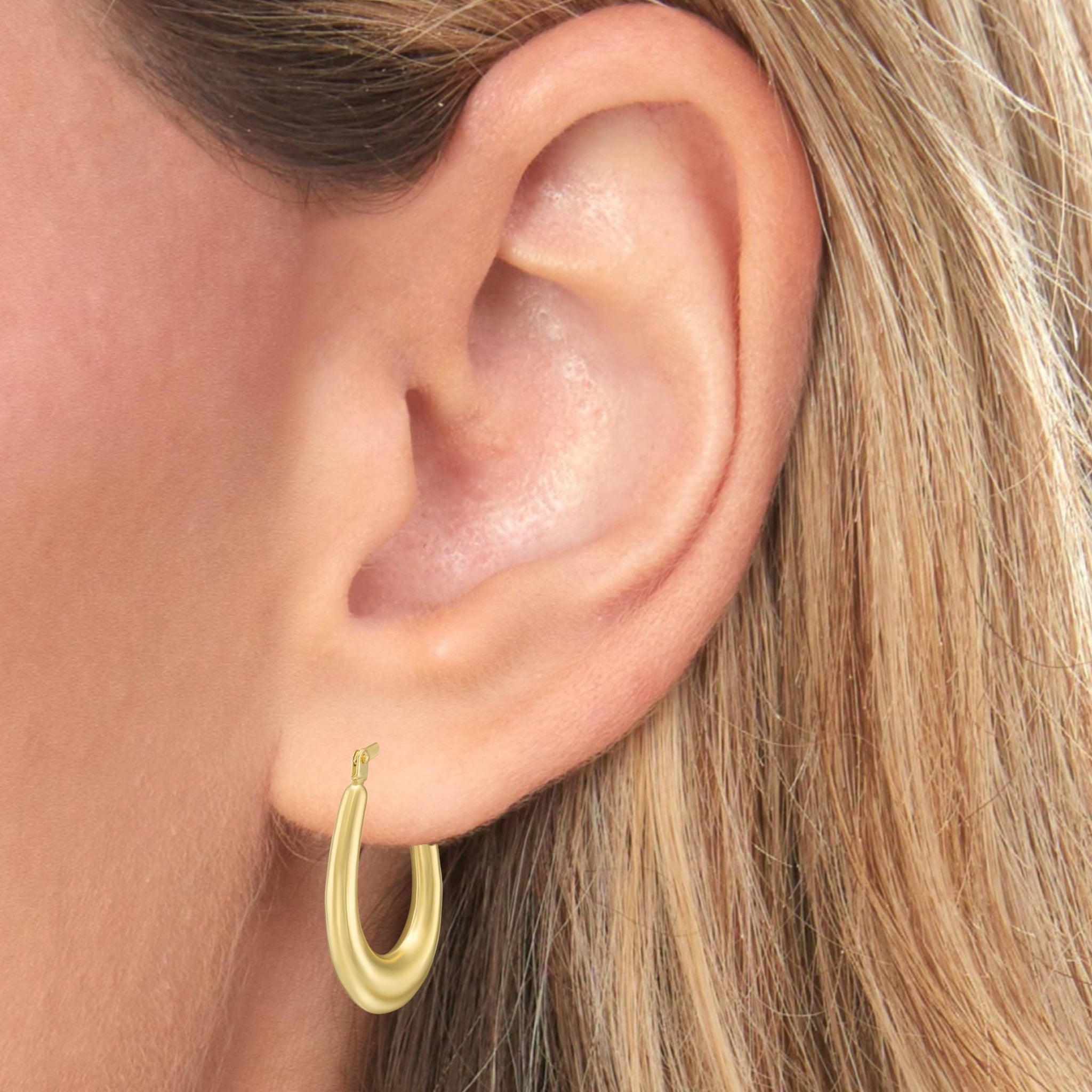 20MM x 16MM DIMENSION— Frame your face with these 20mm x 16mm earrings crafted in radiant 14k yellow gold. Their oval contour provides a stylish twist on the timeless hoop design.