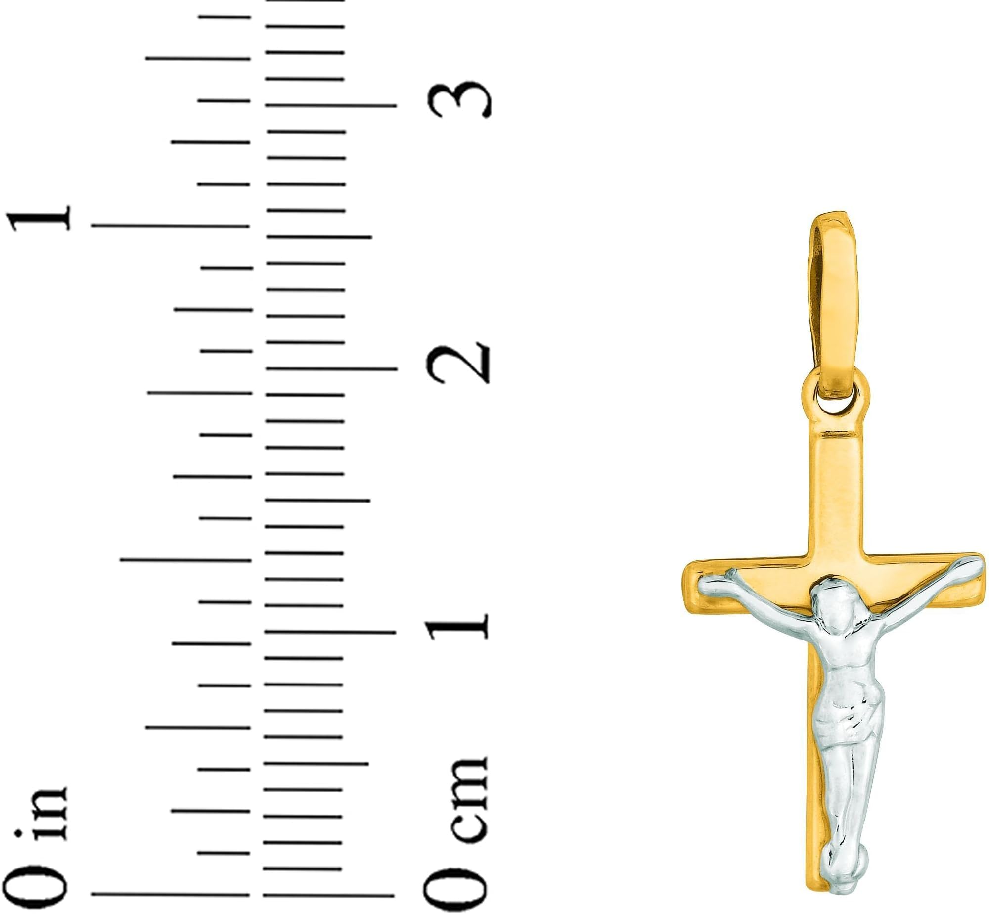 FEATURES— Styled in a classic crucifix design, this pendant features a polished yellow gold cross with a contrasting white-toned figure of Jesus. The two-tone contrast enhances depth and detail, making it a striking and meaningful piece.